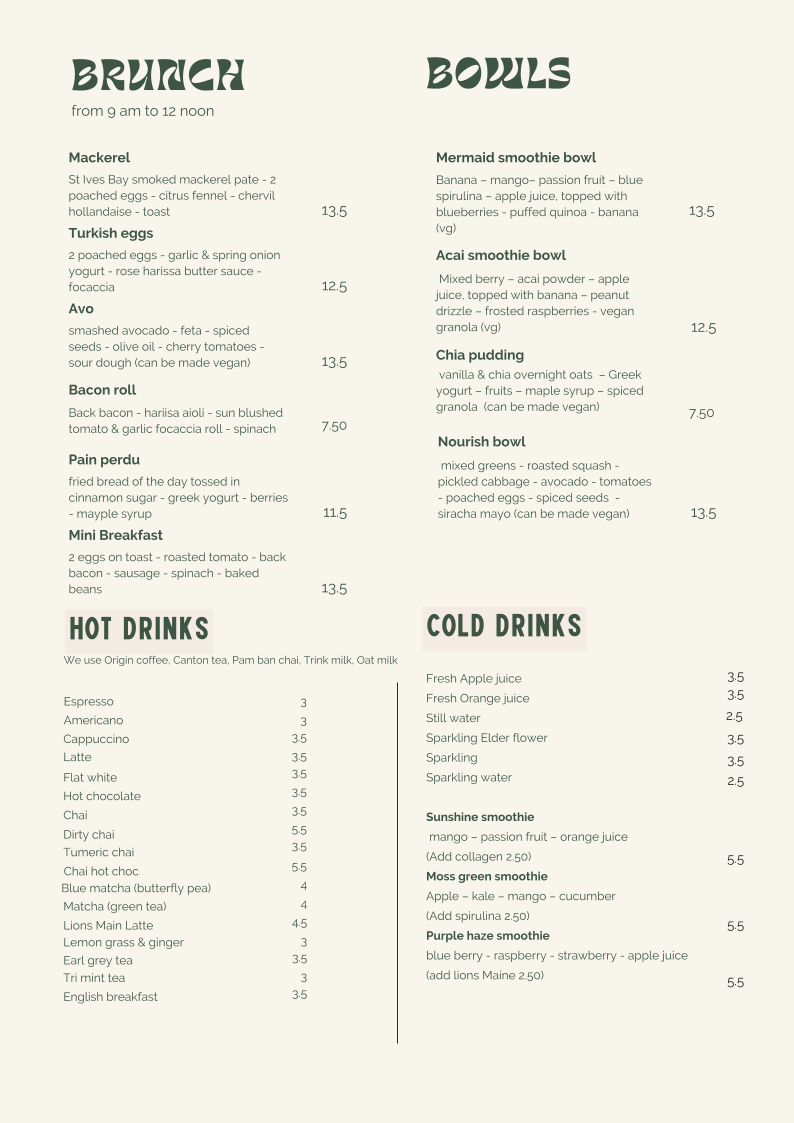 The menu features a variety of options suitable for breakfast, brunch, and light meals throughout the day. It is organized into distinct sections including brunch dishes, smoothie and breakfast bowls, cold drinks, and lighter fare.