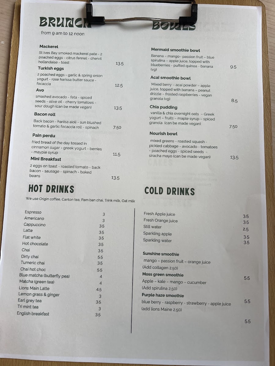Brunch offerings include dishes such as smoked mackerel pate with poached eggs and toast, Turkish eggs with focaccia, smashed avocado with spiced seeds and feta, and a bacon roll with harissa aioli. These selections provide a range of savory choices suitable for a mid-morning or early afternoon meal.