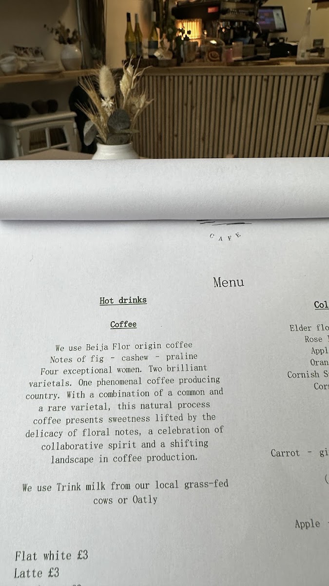 Additional menu highlights include oatmeal, garlic bread, risotto, sea bass, baklava, and affogato, indicating a wider selection of both light and more substantial food items alongside desserts and coffee accompaniments.